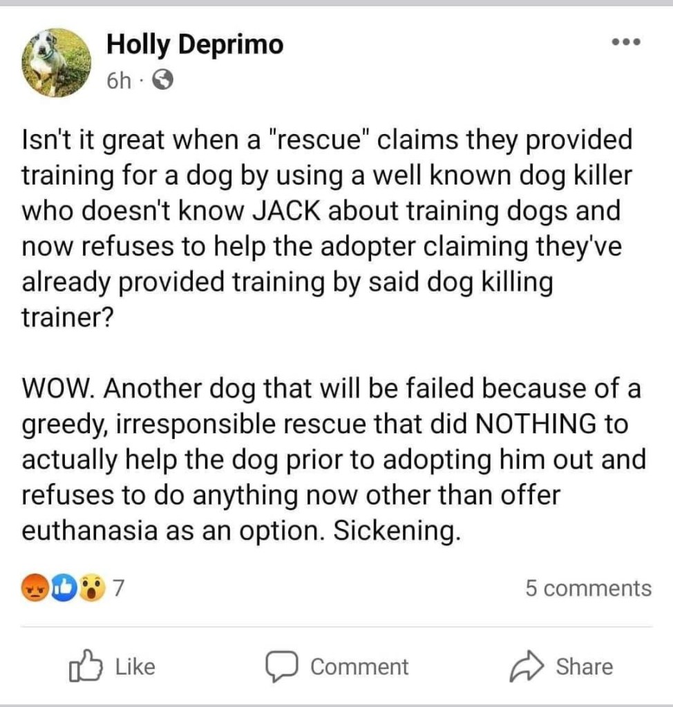Holly you want to talk about blood being on people’s hands, it’s on yours because you neglected to tell the truth, if you had been honest with people about what happened before you took him from Jana and then been about other situations where you have had dogs bite incidents. I have said it once and I will say it again, you should not be pulling dogs when you can not do right by them. This includes providing information that involves others being able to make informed decisions which would aid in giving proper care.